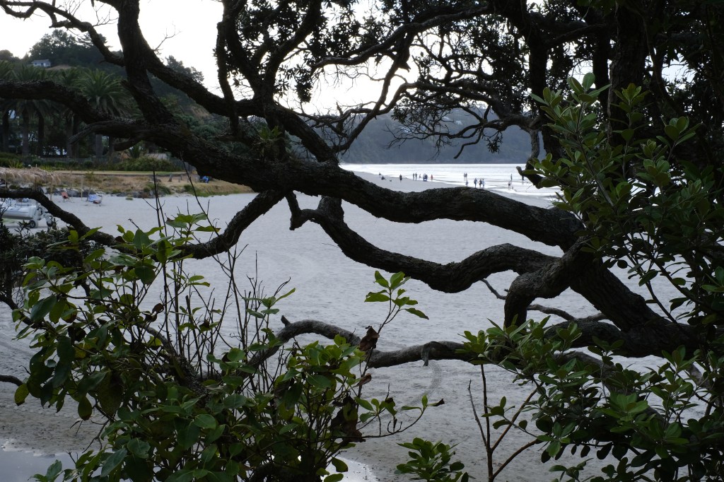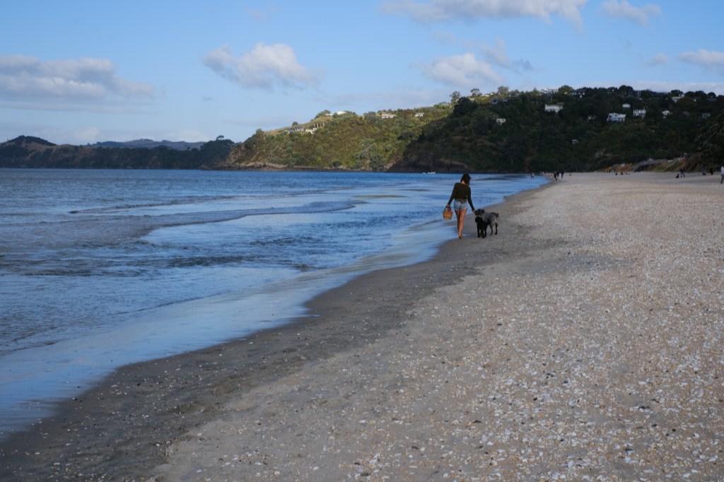 I walked back to the hostel as the wind picked up — NZ weather reminds me of San Francisco, where you kind of just have to carry a jacket at all times but also suddenly get really hot. I walked along Onetangi beach for an hour or two near sunset, playing with some good dogs along the way and finding a secret forest path that unfortunately led to a regular house and not a mystical water wizard hut.