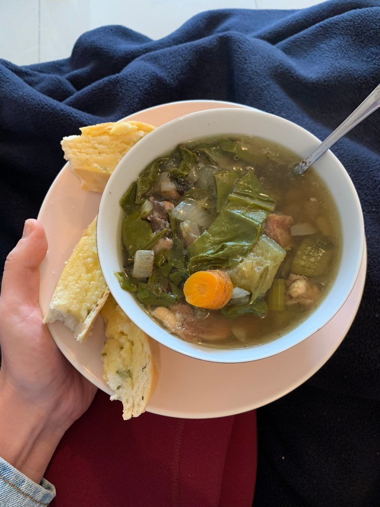 The first coat on the ceiling was finally done, so we had dinner — lamb and veggie stew with homemade garlic bread, hand-kneaded by Luca.