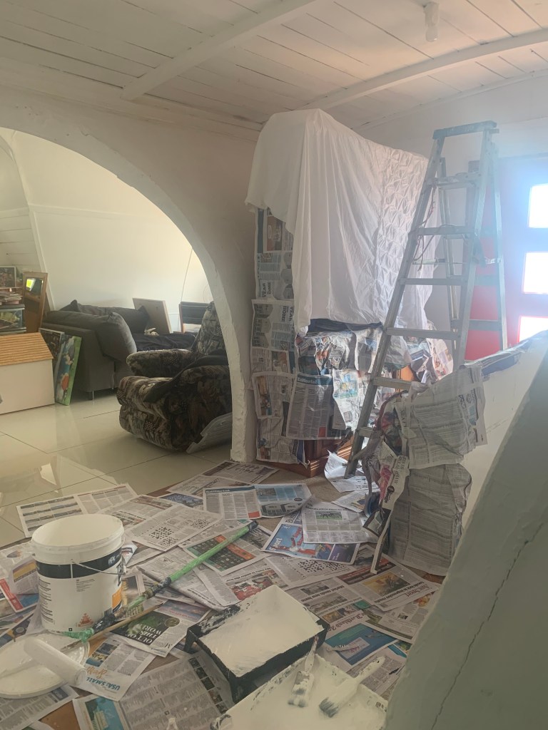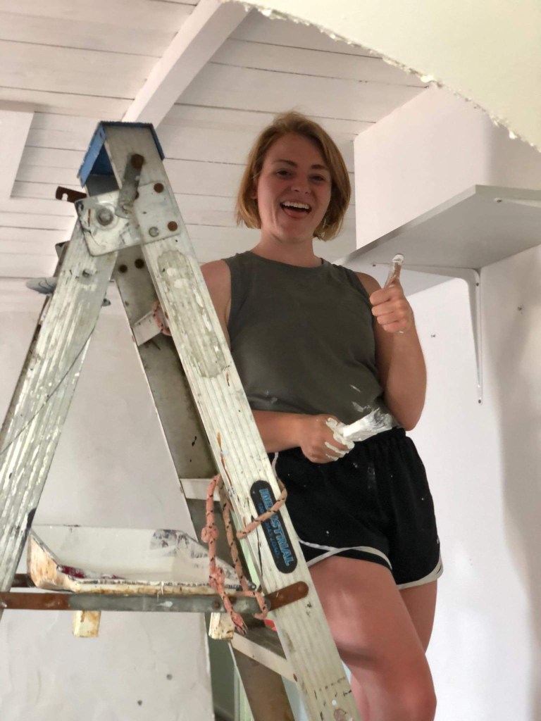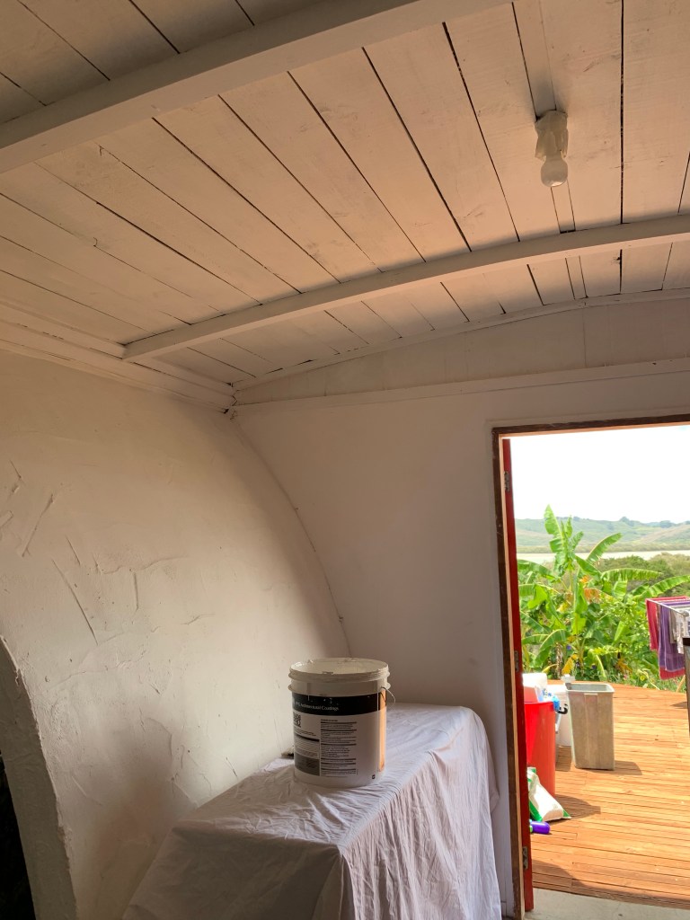 The next morning we woke up to a rare rainy day. Karee mostly needs help painting the hobbit house, as she’s putting it on the market to sell and eventually move to Queenstown. We changed into our painting clothes and prepped to paint the entryway ceiling white, laying down newspaper and drop cloths. Sabrina turned on the 70s jams for background music.