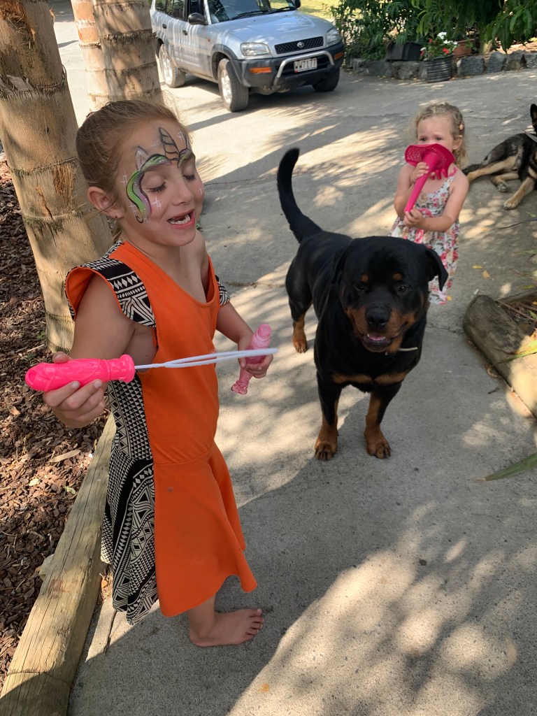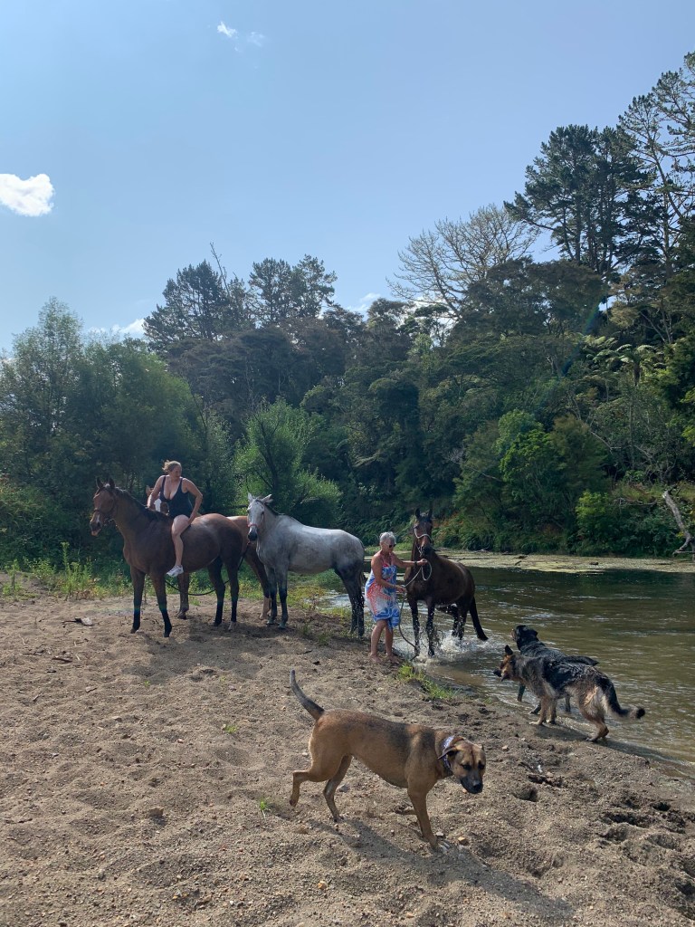 Alas, the fun was not yet over! Karee’s mom Gloria lives on a big farm outside of Paihia (where Karee grew up). We stopped over to hang with a bunch of big dogs, tour the super cool bathroom and swim with horses. And more kids, of course.