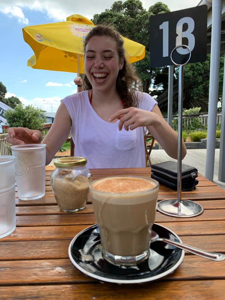 Before going to Paihia, Sabrina and I made a few pitstops. First stop: Opononi Beach, a 20-minute drive west of Rawene, closer to the open ocean. We ordered lattes at Thai Landing Cafe and walked down the coastline a bit, avoiding the cold water.